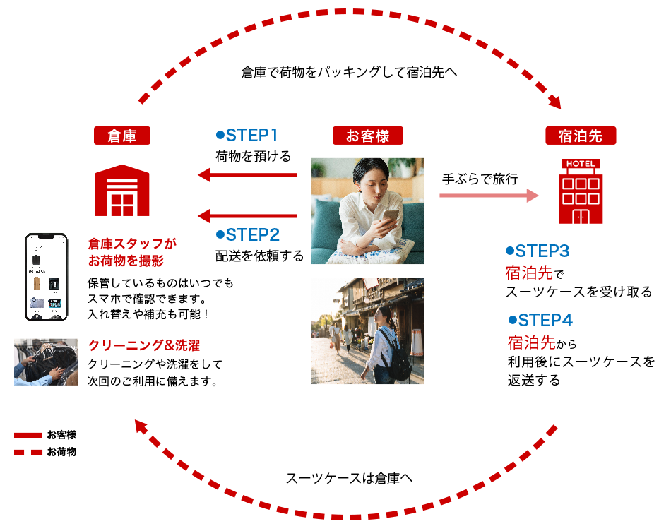 スーツケースや衣類などを専用倉庫に預けておくことで、旅行時に必要なものだけを指定し宿泊先へお届けいたします。往復は最低限の手荷物だけで移動ができます。